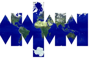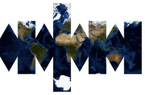 Карта мира на ромбокубоктаэдре. Гномическая проекция. Полюса на противоположных треугольных плоскостях