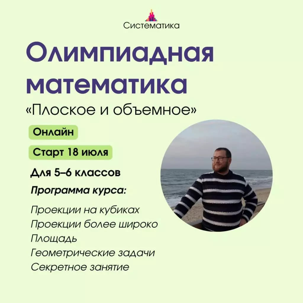 🔴18 июля стартует пятый модуль курса по олимпиадной математике «Плоское и объемное» для 5-6 классов с Дмитрием Иванюком.