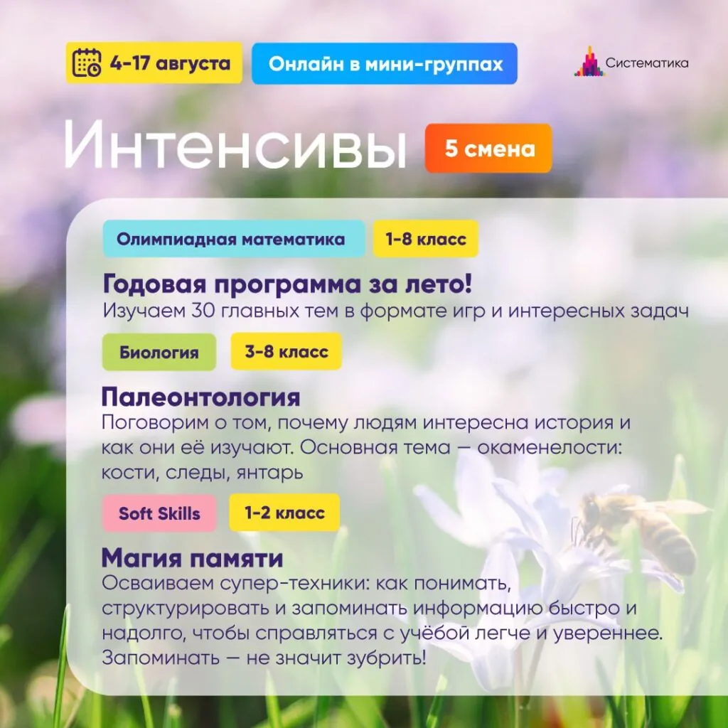 Проведите это лето с Систематикой! 4 августа стартует заключительная 5 смена интенсивов, будет интересно — занимаемся олимпиадной математикой, биологией и прокачиваем Soft Skills!