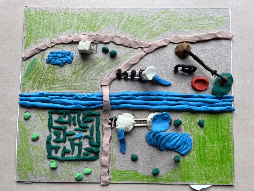 Макет речного парка (2 фото). В нем есть лабиринт из кустов, река, два пруда и две детских площадки с горками, каруселью, тарзанкой и качелями. Также есть киоск мороженого, мост через реку и молодые деревья.
