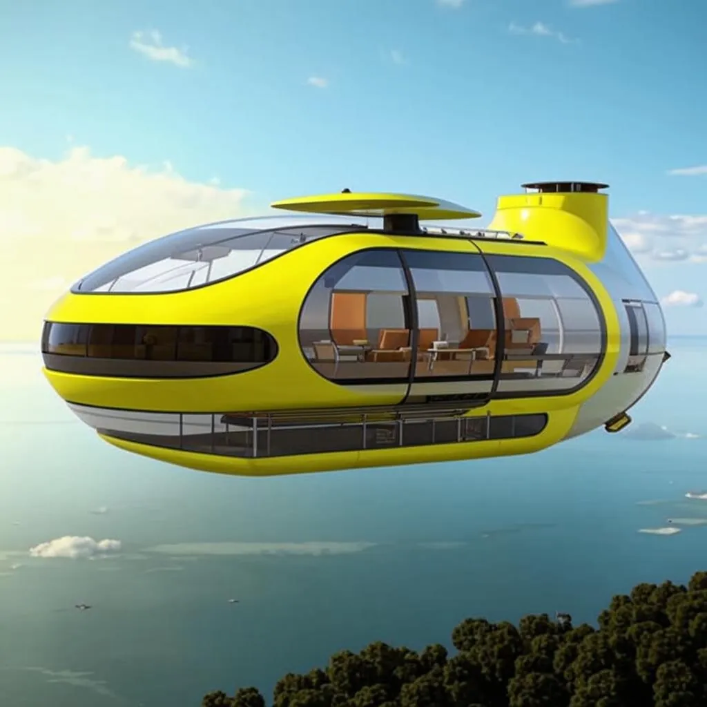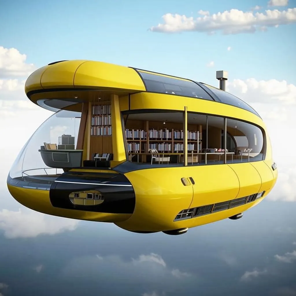 Индивидуальный транспорт будущего — летающий дом (5 фото). Выглядит, как обтекаемое судно, похожее на ботинок с прозрачными стенами. В передней части находится библиотека за обзорными окнами. Наверху спальня и ванная комната, внизу столовая с панорамными окнами. Сзади есть реактивные турбины. Дно ровное, чтобы можно было приземлиться или приводниться на любую поверхность. Цвет желтый.