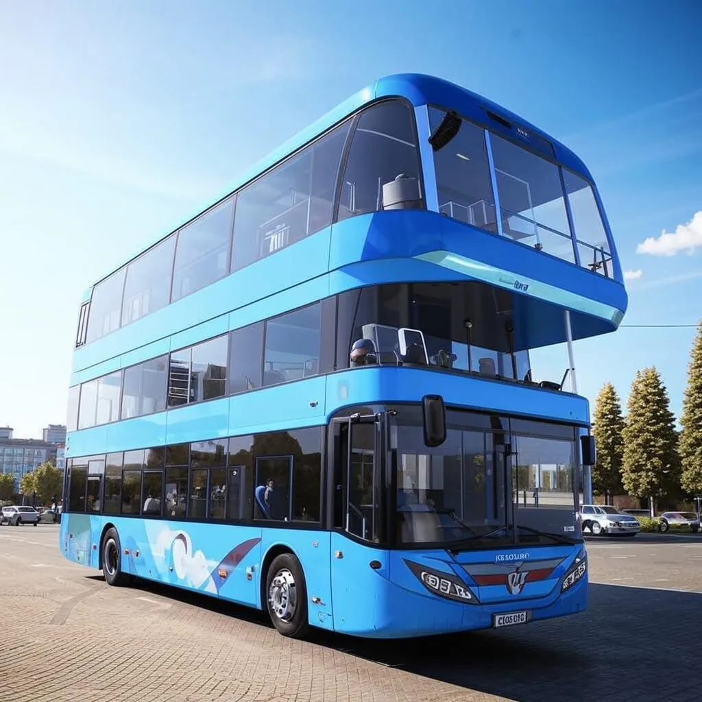 Футуристический автобус с четырьмя этажами голубого цвета (4 фото, ребята учились пользоваться ИИ). Ширина 7 метров. На первом этаже пассажирские сидячие места. На втором этаже ресторан и парикмахерская. На третьем этаже кафе, на четвертом этаже магазин. Третий и четвертый этажи целиком с прозрачными стенками.