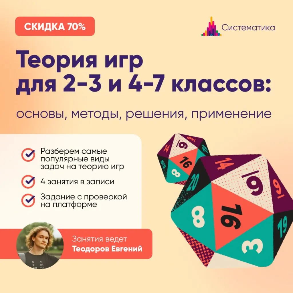 ✔️Мы пройдём увлекательный путь, разберём самые популярные виды задач на теорию игр, затронем прикладные аспекты.