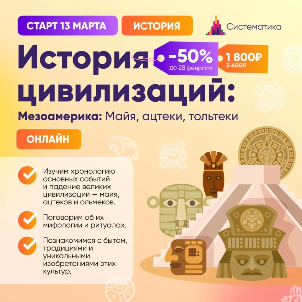 Будем изучать тайны и легенды древней Мезоамерики. Погрузимся в загадочный мир древних цивилизаций Мезоамерики: майя, ацтеки, ольмеки и тольтеки. Изучим их религию, мифы, ритуалы, а также повседневную жизнь, традиции и достижения в науке и культуре. Разберёмся, как эти уникальные народы повлияли на развитие человечества, и что мы унаследовали от них.