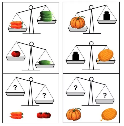 (А) 2 морковки легче, чем 2 помидора, а тыква легче дыни (Б) 2 морковки тяжелее, чем 2 помидора, а тыква тяжелее дыни (В) 2 морковки тяжелее, чем 2 помидора, а тыква легче дыни (Г) 2 морковки легче, чем 2 помидора, а тыква тяжелее дыни