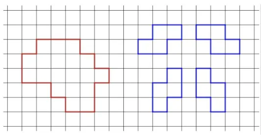 Лиза нарисовала на клетчатом поле красную фигурку (см. рисунок). Какое минимальное количество клеточек Лиза должна добавить к своей фигурке, чтобы её можно было разрезать на S-тетрамино (так называются фигурки, нарисованные синим справа)?