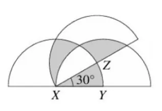 Три полуокружности пересекаются и образуют угол zxy равный 30 градусам. Площадь каждой полуокружности 24, х y z центры недорисованных окружностей. Найдите суммарную площадь заштрихованной части.
