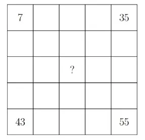 Арифметическая прогрессия — это последовательность чисел, в которой каждое число, начиная со второго, получается из предыдущего добавлением к нему некоторого постоянного числа, которое называется шагом прогрессии. Например, наборы чисел 1, 2, 3, 4, 5, ... и 2, 5, 8, 11, 14, ... — это арифметические прогрессии с шагами 1 и 3 соответственно. Известно, что числа в любой строке и любом столбце в таблице ниже составляют арифметическую прогрессию. Чему равно число в центре таблицы?