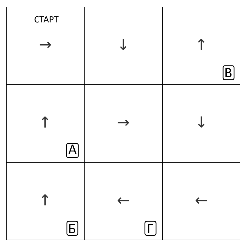 Робот Бобби оказался в лабиринте. Он начинает в клетке с надписью СТАРТ и из каждой клетки делает шаг в ту сторону, в которую указывает стрелочка в клетке. В какой клетке Бобби окажется ровно через 5 шагов?