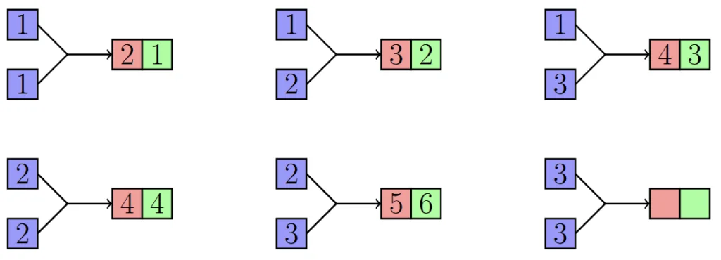 Волшебная машина состоит из четырёх квадратов и колдует с цифрами. Если записать в синие квадраты две цифры, как показано на картинках, получатся результаты в красном и зелёном квадратиках. Определите, что именно машина делает с цифрами, и напишите, что нужно записать в красный и зелёный квадратик в последнем примере.
