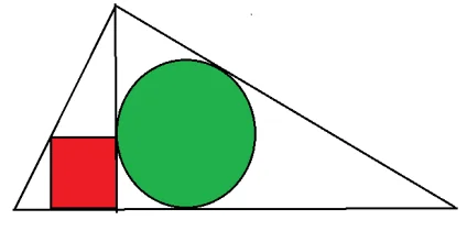 В прямоугольном треугольнике ABC с прямым углом C проведена высота CH. Радиус круга и сторона квадрата, вписанных в образовавшиеся треугольники равны 1 (см. рисунок). Чему равна гипотенуза AB? Ответ округлите до десятых.