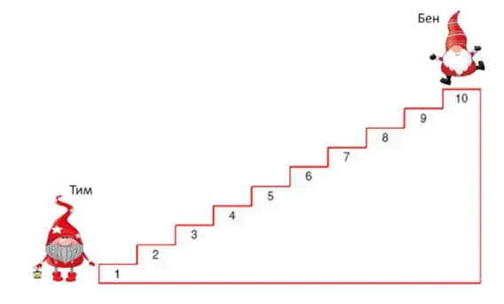Два гнома, Тим и Бен, одновременно движутся по лестнице. Каждый раз, когда Тим поднимается на 4 ступени, Бен спускается на 3 ступени. Если Тим достиг 8-й ступени, то на какой окажется Бен? (На одной ступеньке помещаются оба гнома)
