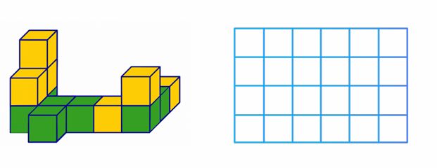 Алёна построила из кубиков фигуру, используя часть – желтых кубиков, часть – зелёных. Изобразите, как будет выглядеть эта постройка, если смотреть на неё сверху. (Закрасьте клеточки цветом или обозначьте буквами Ж и З)