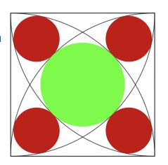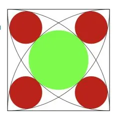 В квадрате провели четыре окружности с центрами в вершинах и радиусами равными стороне квадрата. В образовавшиеся фигуры вписаны 5 кругов. Что больше: площадь зелёного круга или сумма площадей четырёх красных? Во сколько раз?