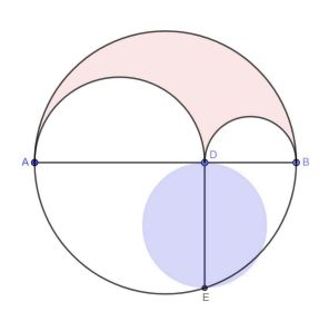 В волшебном лесу живут эльфы и феи, которые постоянно ссорятся. Но в День начала осени короли Оберон собирает их на одной полянке круглой полянке. В этом году сказочные создания решили поступить по-умному и разделить места для танцев эльфов и фей так, чтобы они не встречались и не ссорились. Для этого круглую полянку разбили на две части, проведя диаметр AB, на нём выбрали произвольную точку D, а от неё восстановили перпендикуляр DE до точки E на крае полянки. Построили полукруги с диаметрами AD и DB, и вся часть полянки выше этих полукругов (на рисунке выделена красным) досталась феям. А эльфам достался круг, диаметром которого является отрезок DE (на рисунке выделен синим). Кому досталось больше больше места для танцев в этот День начала осени: эльфам или феям?