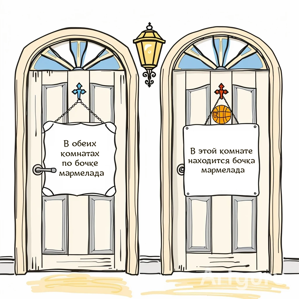 Перед вами две двери. За дверьми может находиться только одно: бочка мармелада, или пакет с конфетами. На одной двери написана правда, на другой – ложь. Что находится за каждой дверью?