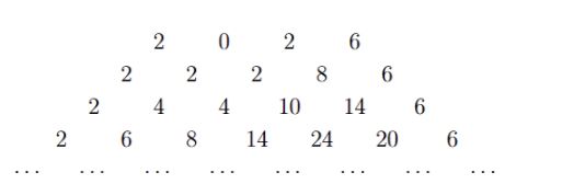 Математик Илюша решил придумать свою, математическую новогоднюю ёлку, поэтому он написал на доске цифры 2, 0, 2 и 6, а числа в каждой следующей строчке получал по следующему принципу: - в начале всегда 2; - в конце всегда 6; - все промежуточные числа равны сумме верхнего левого и верхнего правого их соседей. Первые четыре строчки новогодней ёлки Илюши выглядят так (см. рисунок) Сумма всех чисел в последней поместившейся на доску строчке равна 5120. Чему равно предпоследнее число в этой строчке?