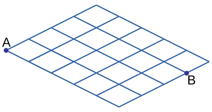 Фигура Циклоп может съесть свою жертву или переместиться в новую позицию если может добраться до неё двигаясь только по 2 направлениям из четырёх по границам сетки (можно, например, совершать сколь угодно много шагов вправо и вверх, но нельзя при этом делать ни одного шага влево или вниз) Подсчитайте количество различных маршрутов для Циклопа (находящегося в т. А) позволяющих добраться до цели(в т. Б).